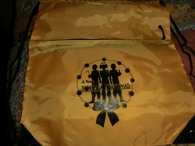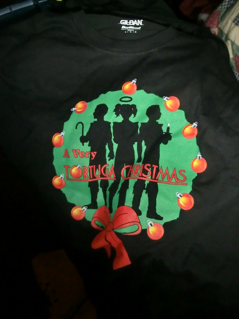 There are some exciting new merchandise...y things that will be available at the Twins merchandise cart. Â We have some leftover shirts from our "Highly Successful" (yeah, it SOLD OUT) Christmas Show and they will be available for purchase (not to worry, kickstarter people, these shirts are quite different from the ones that were part of your applicable rewards packages.) Â There are also a few (very few - less than six) of the special cinch packs which were made for the show. Â So...if you'd like to have a piece of Tortuga History, better get them while we have them. Â Once they're gone, they're gone.