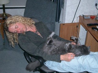 Something bad has happened at the Louisiana show however; partly because we have sold so many "Beer Show" DVDs and partly due to the bad influence of our good friend's Todd and Ruth Thompson. Also, probably because we perform in a bar, another Beer show seems to have started. Ironically I had planned on NOT drinking that day, I had things to do, like helping young Sarah with her CD creation, But between running into a very old friend who,d brought four flasks of rum, this surprise Beer show, and the Post show roast by Christophe the Insulter where I was not only mercilessly insulted, (the video was shot for this site and will be released here later) but was forced to drink even more, I ended-up hammered! I was supposed to get dressed, (we had a dinner date at a nice restaurant later) and then help Sarah with her CD, This is how London and I ended-up: Me passed-out, he sound asleep in my lap, and I am holding her paw, aaaaaw,