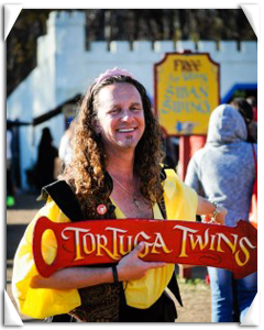 1990 spelled the season of change for Ronn Bauman when his friendship with Riki Robinson and Jef Hall cemented into a partnership that has since carved out a niche for itself in the annals renaissance festival history. The Tortuga Twins blossomed and grew with the induction of Scaramouche Tortuga as together the three comedians fused their diverse talents into a finely honed blend of comedy, timing, and unbridled chutzpah.